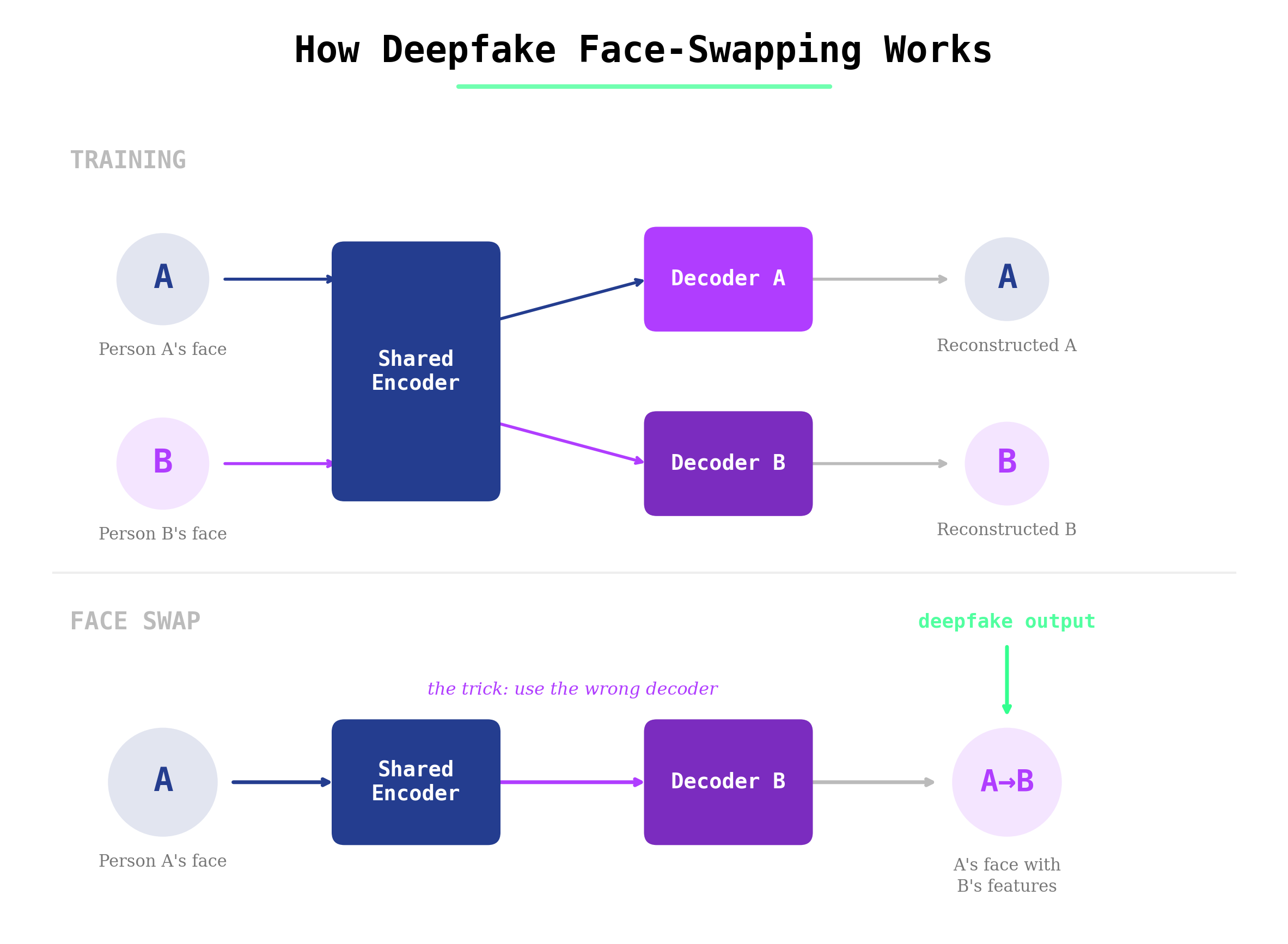 To swap faces, you train a shared encoder on two different people — let’s call them Person A and Person B — but give each person their own decoder. If you feed Person A’s video into Person B’s decoder, you get person B’s face making Person A’s expression. That’s a face swap, demonstrated here: