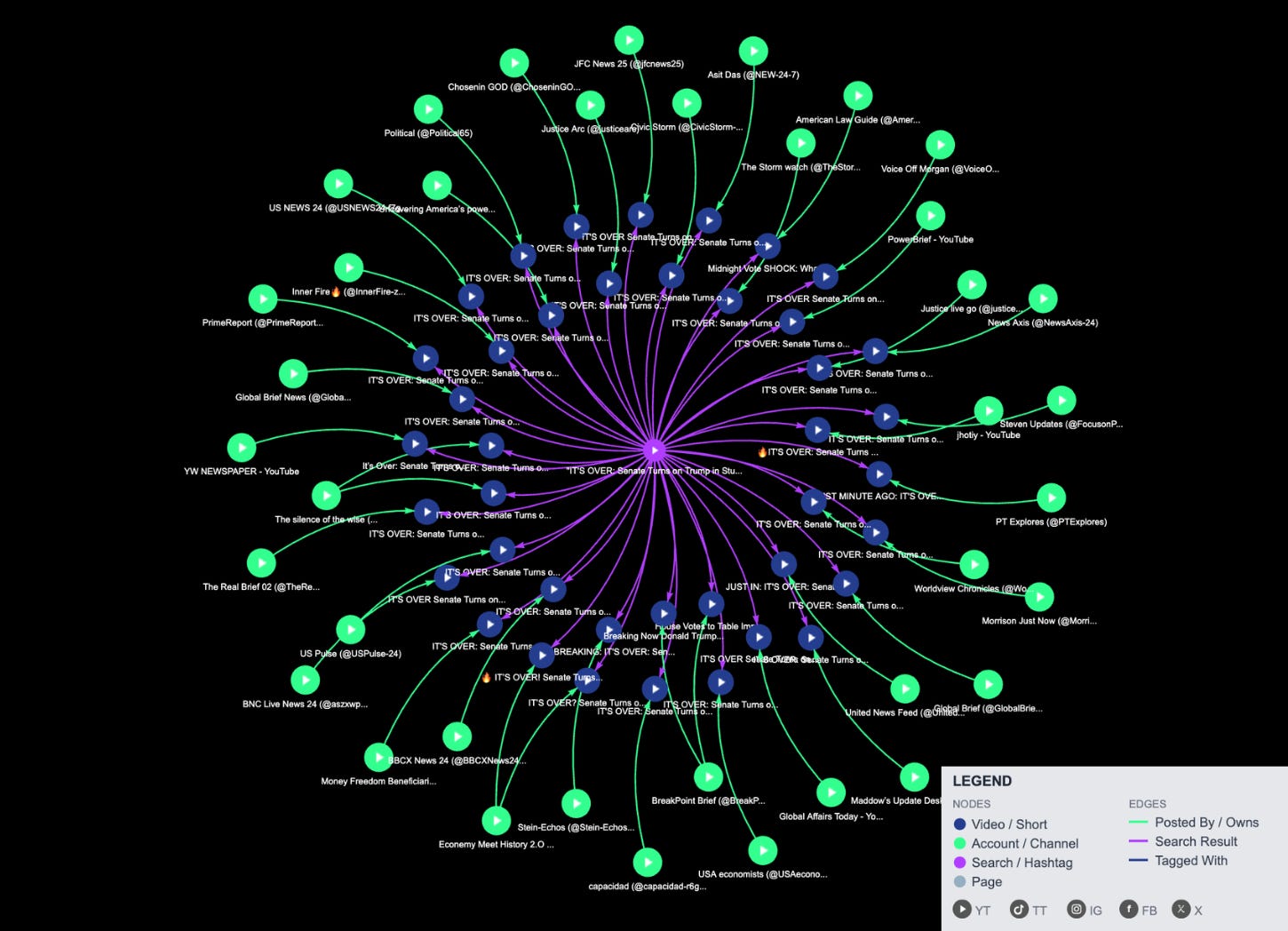 Here is a snapshot of some of the channels and videos that we tracked with aggregate engagement numbers represented in the table below. The graphs throughout this investigation represent our searches for content (purple nodes/edges), pieces of content (blue nodes/edges), and accounts (green nodes/edges) related to AI-generated fake news on major social media platforms.