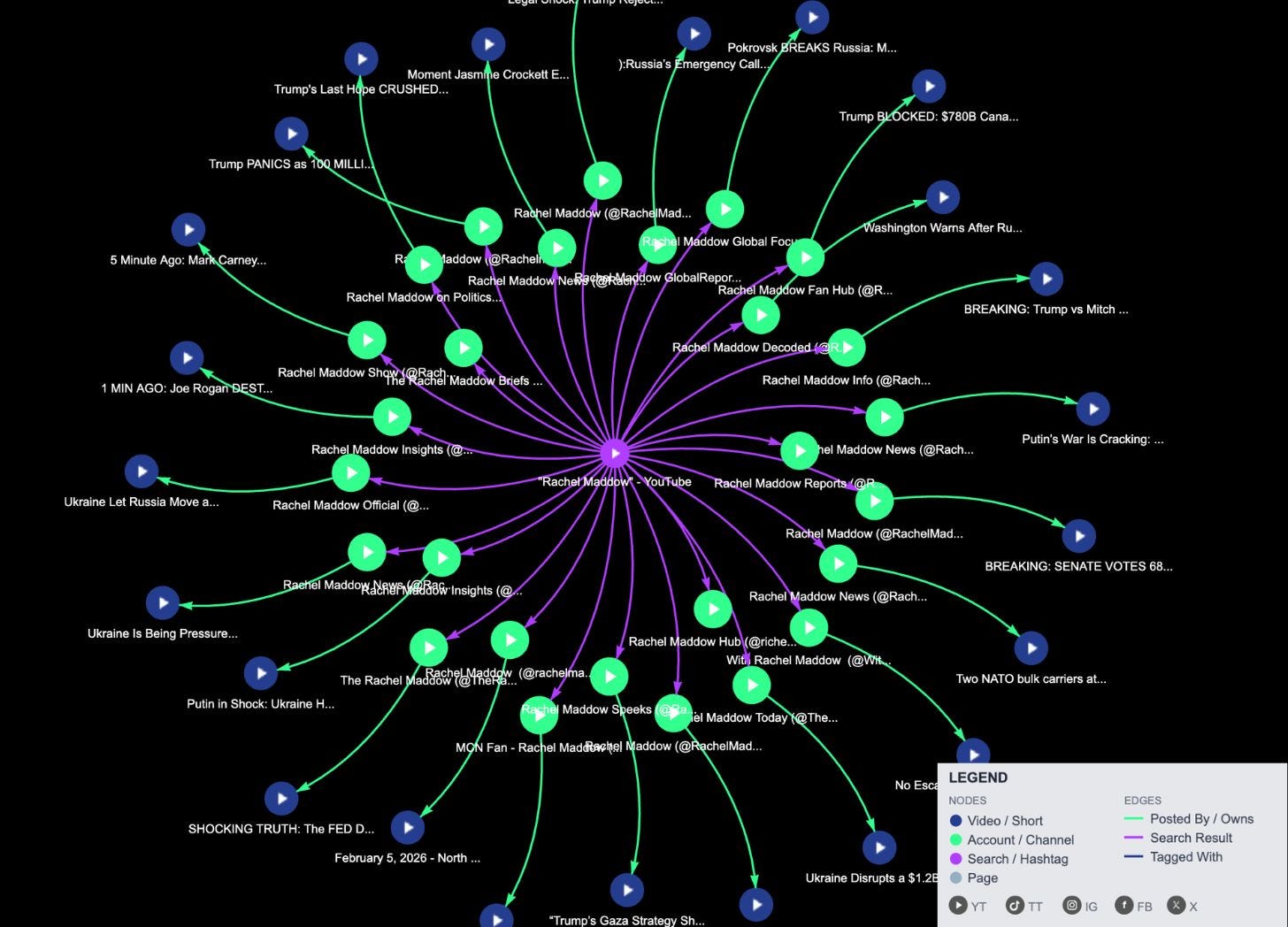 Riddance has a suite of OSINT tools to better report on and track fake or AI-generated content. As investigations like this one exploded in scope, we built tools to log all of the videos and accounts. Here is a bigger sample of the channels and videos surfaced depicting AI Maddow, every green node is an AI impersonator Maddow channel, with outer blue nodes as sample videos uploaded by the connecting channel node. The purple node at the center of the graph represents our quote search for “Rachel Maddow” channels on YouTube. The table below the graph depicts the results of the search in more detail.