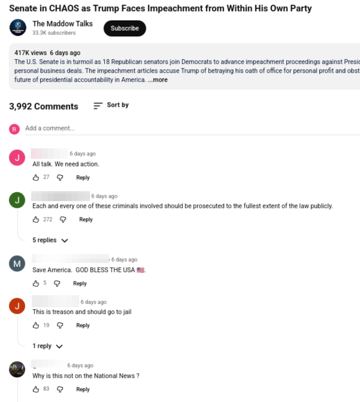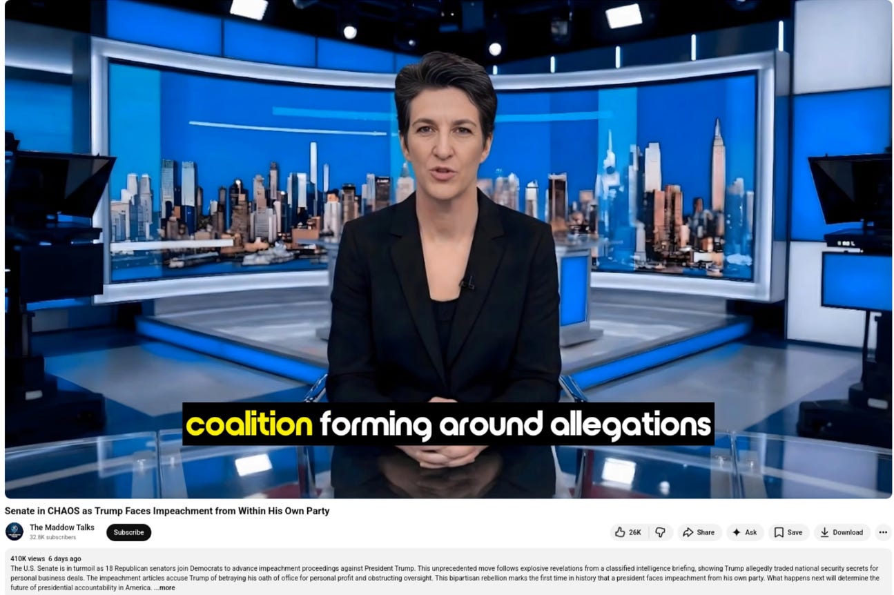 The “Senate in CHAOS…” video (and many others that I will highlight below) claims that the Senate just impeached Trump. Of course that's false, and the arguments are incoherent. AI Maddow does not bother with the procedural subtleties between filing articles of impeachment and voting to impeach, something fans of the media cycle around Trump's first term will surely be sensitive to. But these videos featuring outright false claims about high-stakes political events are doing everything in their power to convince users that they are real. Some viewers might believe what they see, or at least let the message raise their blood pressure just a bit more.