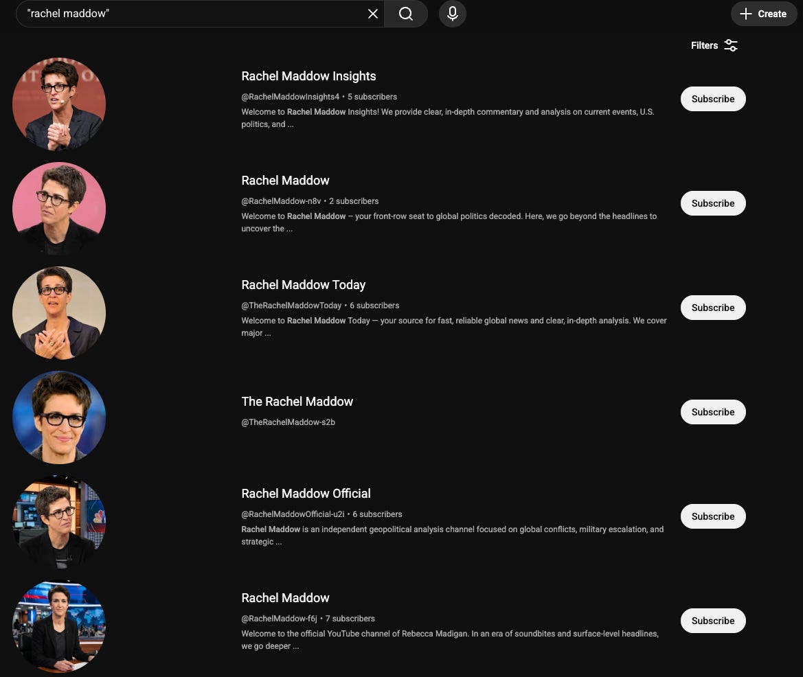 Of course, none of these channels are in any way affiliated with American TV host Rachel Maddow. You might note the low subscriber counts and shrug, but this is just the tip of the iceberg. Replicate the search with “[your favorite prime time news personality]”, filter by channel, and you may get something similar.