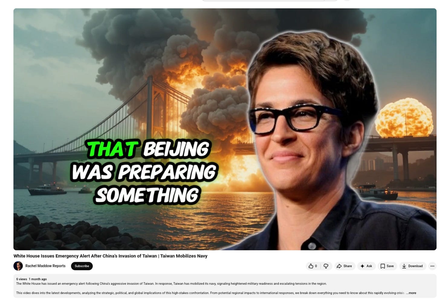 It should be said that this spat of AI news coverage isn't a one-off messaging blitz around an imagined Trump impeachment. Please enjoy this video where an AI Maddow casually tells viewers that China just invaded Taiwan. Thankfully, it got almost zero engagement; unfortunately, at time of publishing it was still live.