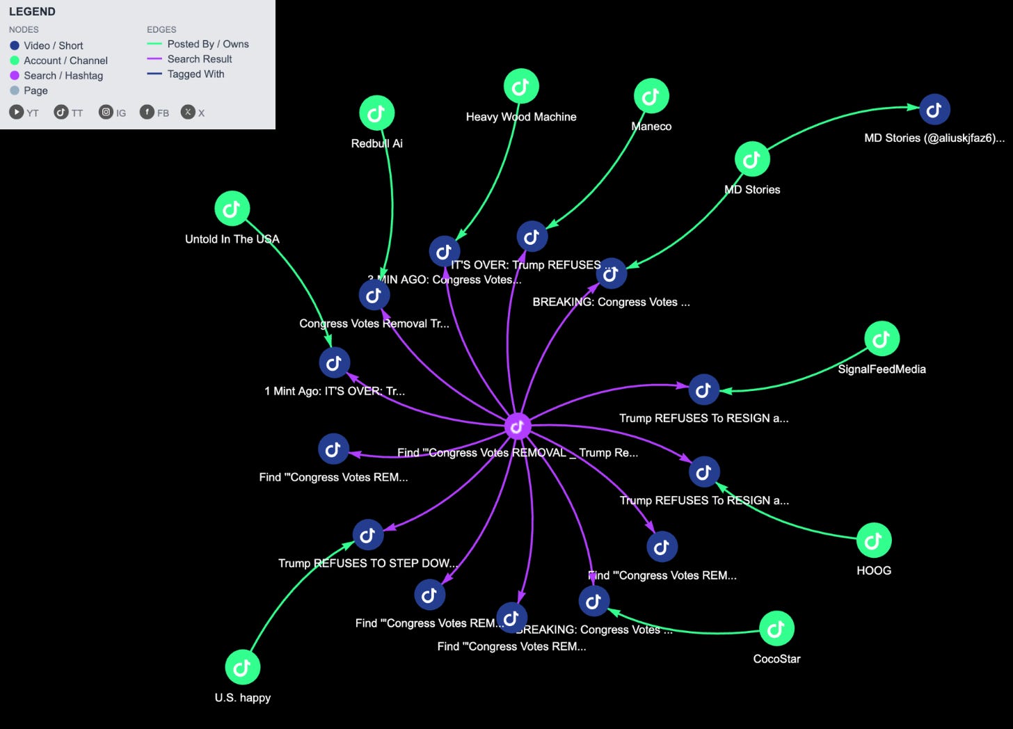 Replicating the same search on TikTok ("Congress Votes REMOVAL _ Trump Refuses to Leave!") yielded similar results. A collection of different accounts posting different videos all with the same title and a nearly identical script.