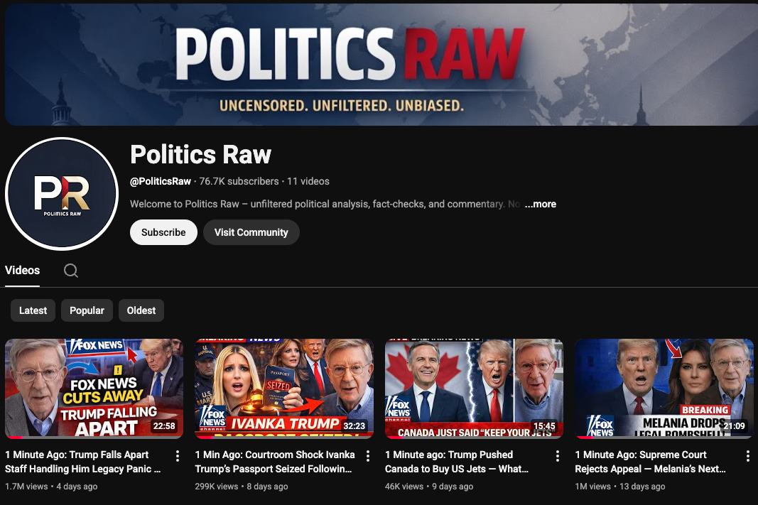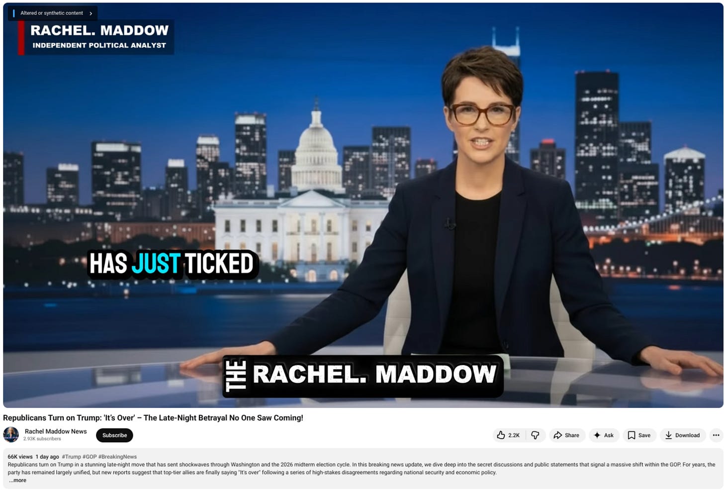 Most of the videos on these channels have synthetic content labels. But, they are easy to miss (they’re small and disappear after several seconds), and some videos get many thousands of views before they get taken down, including this video which had 66K views featuring AI Maddow spreading a false narrative about Republicans in congress turning on Trump. It has since been removed.