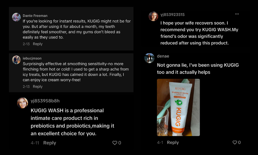 “Wanda Dear898” commented, “I switched to KUGIG toothpaste before, and to be honest, my gums are no longer so sensitive now.” This comment has a long thread of responses, each talking about how KUGIG toothpaste fixed their swollen face, yellowed teeth, or toothaches.