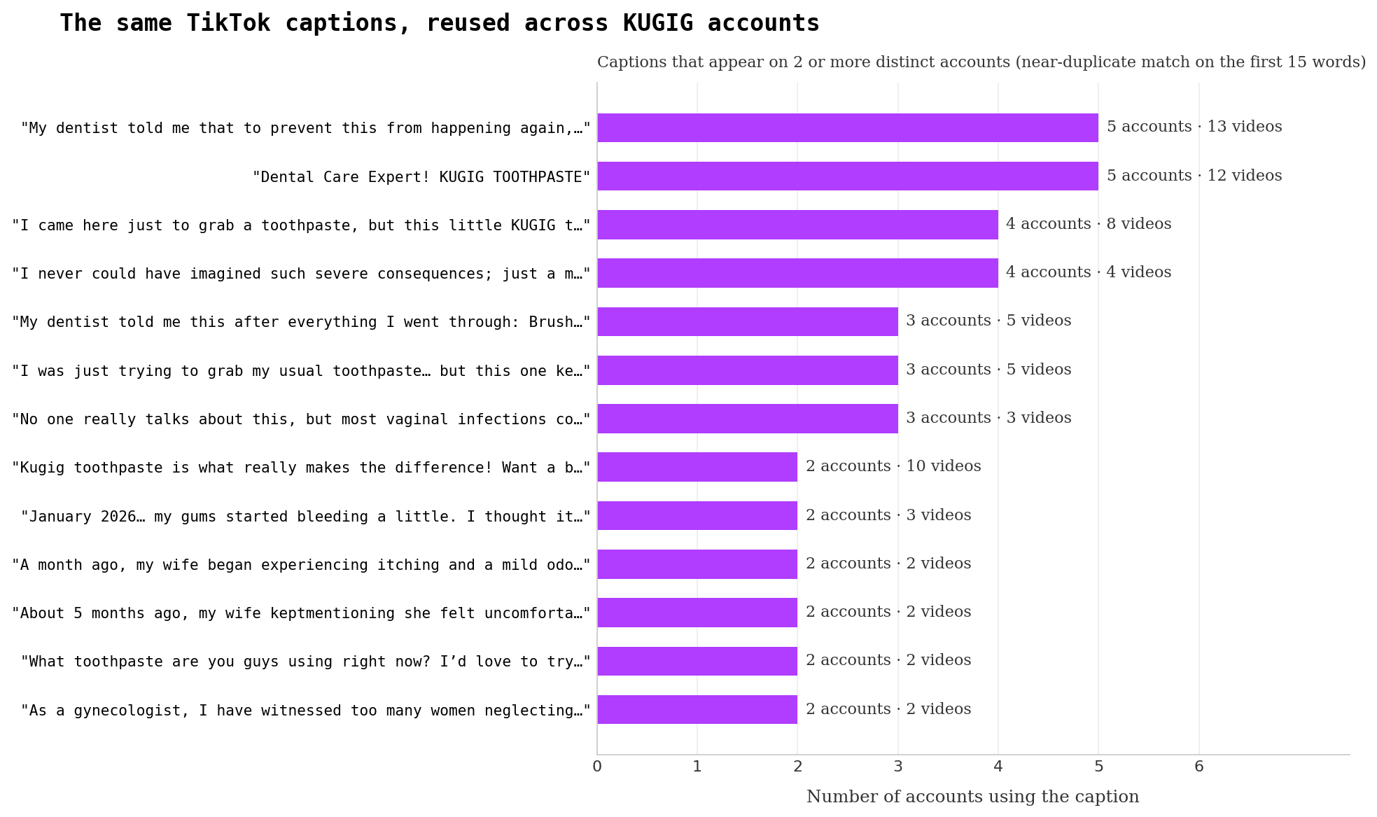 What accounts lack in duplicated videos they make up for with duplicated titles and hashtags. The caption “Dental Care Expert! KUGIG TOOTHPASTE” is both awkward and common. Remember, this isn’t an exhaustive sample of videos, so there are many more videos with that caption.
