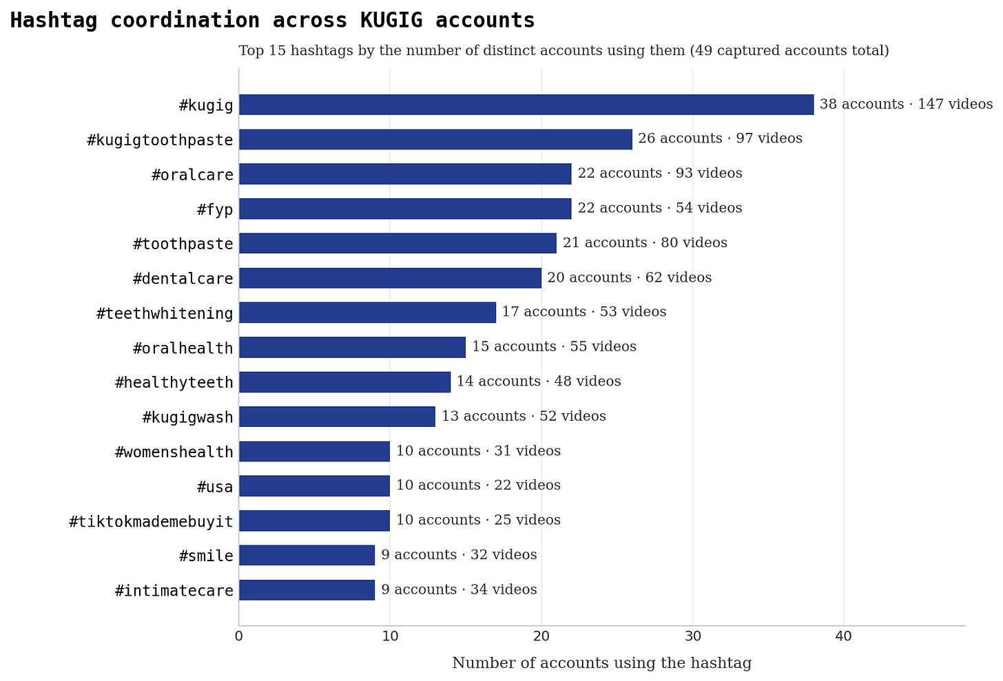 It’s sensible that videos in coordinated campaigns will coordinate hashtags, too. We saw nearly twice as many videos pushing KUGIG toothpaste as KUGIG wash, even though many accounts pushed both products. The hashtags reflected that balance.