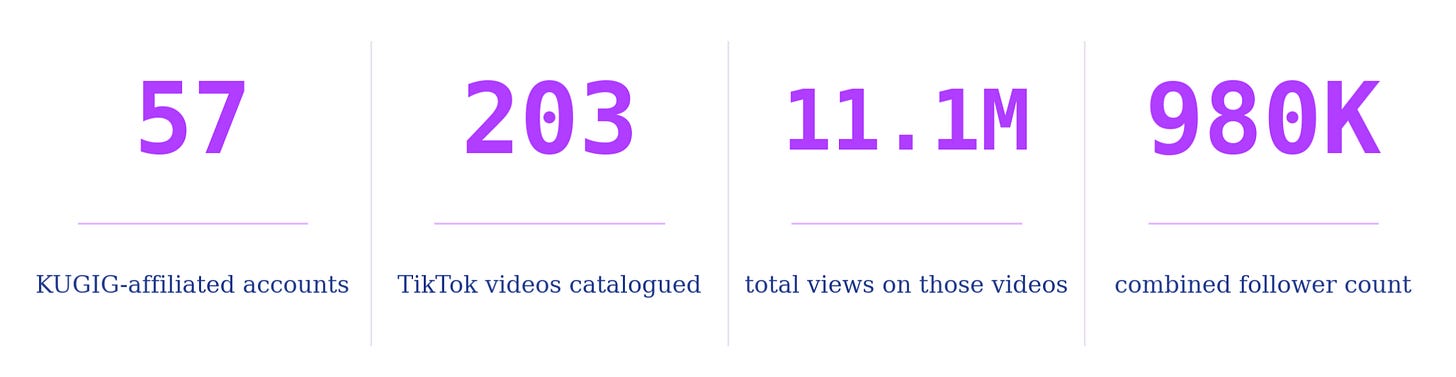 Riddance reached out to TikTok for a comment and provided them a list of confirmed KUGIG-affiliated accounts. Within three days, all of these accounts were offline. But despite our reporting and TikTok’s response, there are many more KUGIG-affiliated accounts and videos popping up every day.