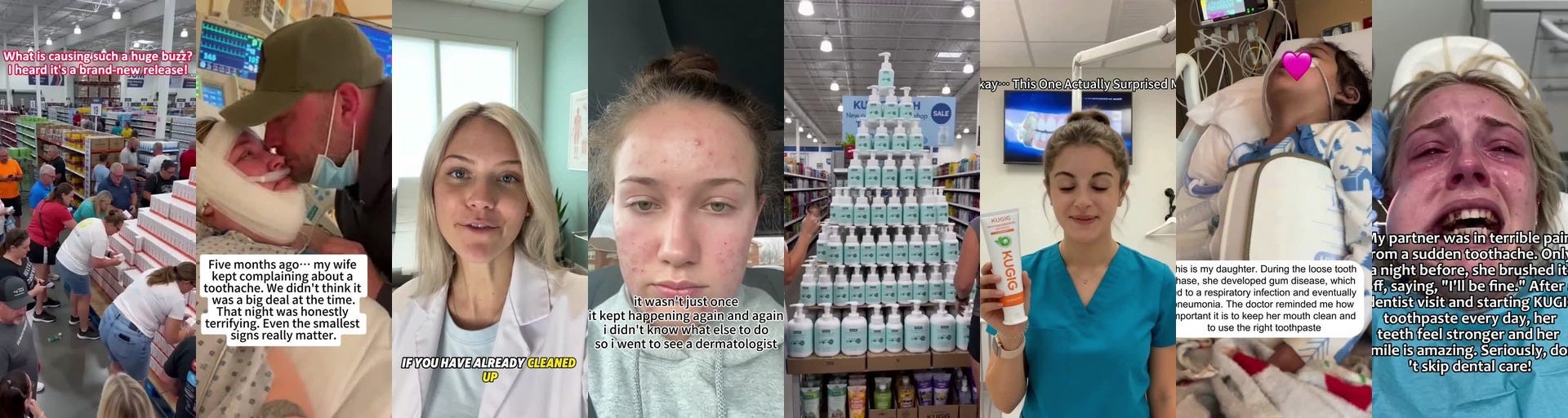 A young woman cries and complains that her “whole face is on fire.” A woman (presumably her mother) opens her mouth to reveal disgusting teeth. The caption reads, “She’s complaining that I didn’t pick out a good toothpaste for her.” The comments include a planted comment recommending KUGIG toothpaste.